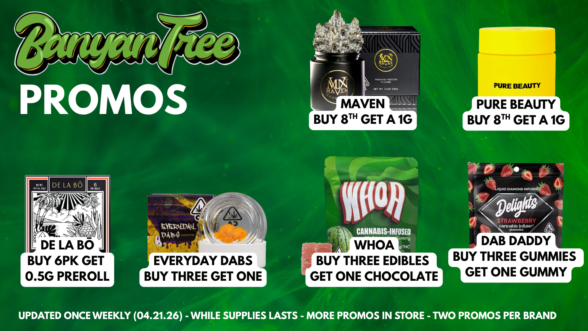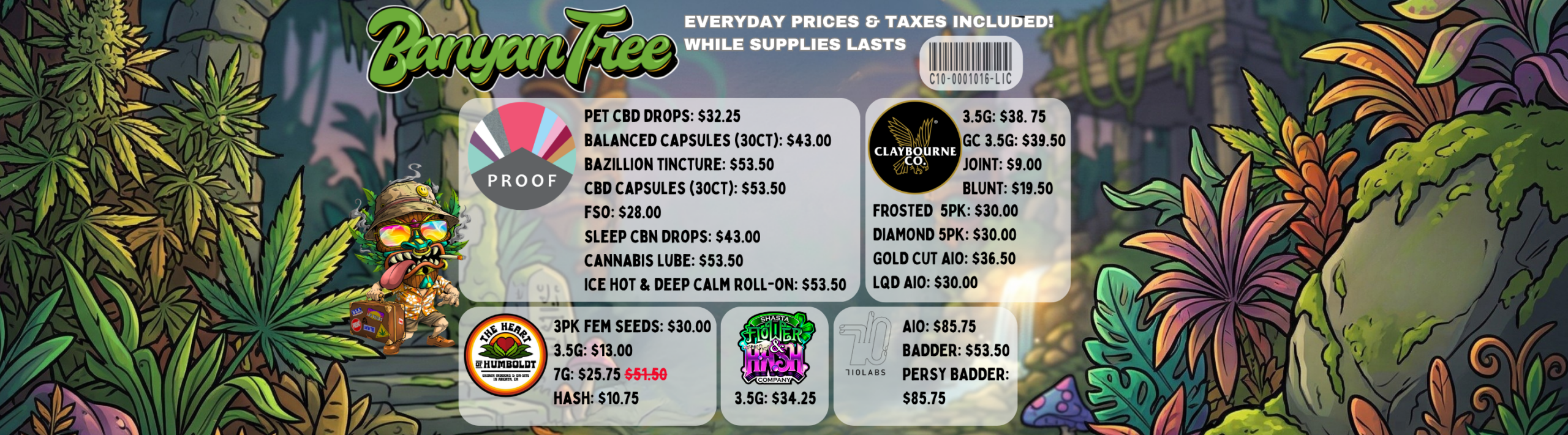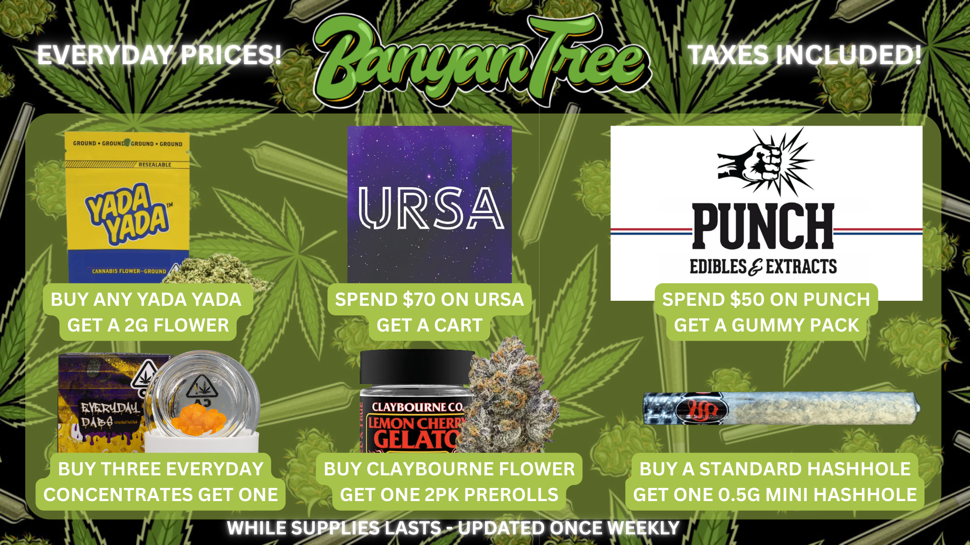 The Banyan Tree mission is to empower individuals and communities to achieve holistic well-being and joyful experiences through responsible cannabis consumption, focusing on access to high-quality, therapeutic products.